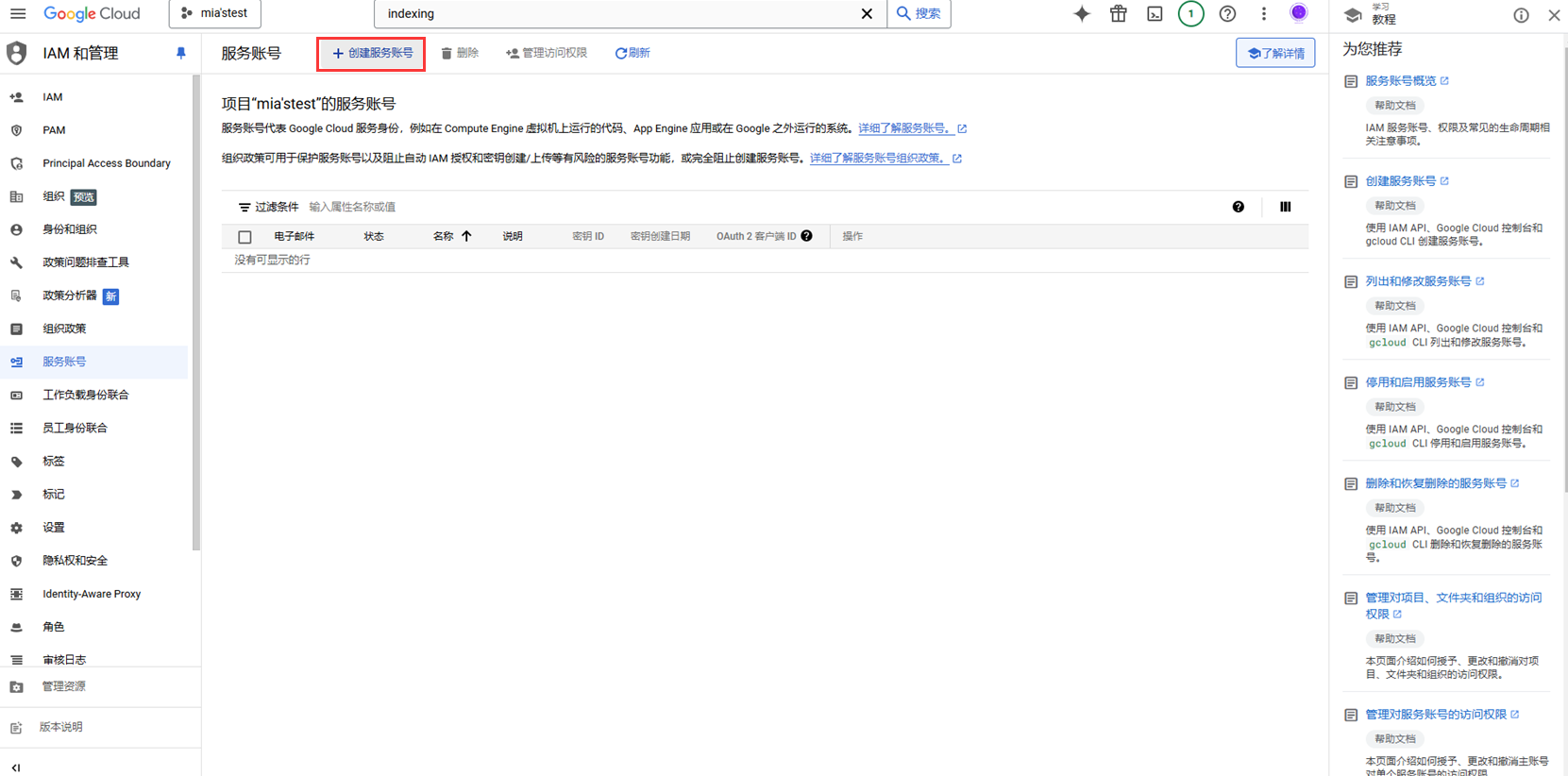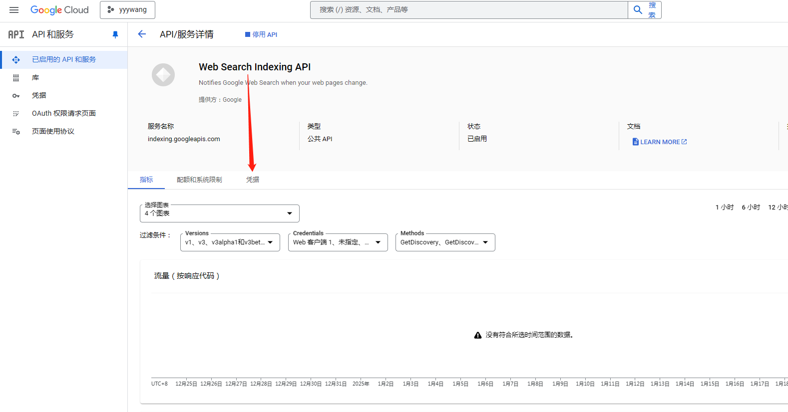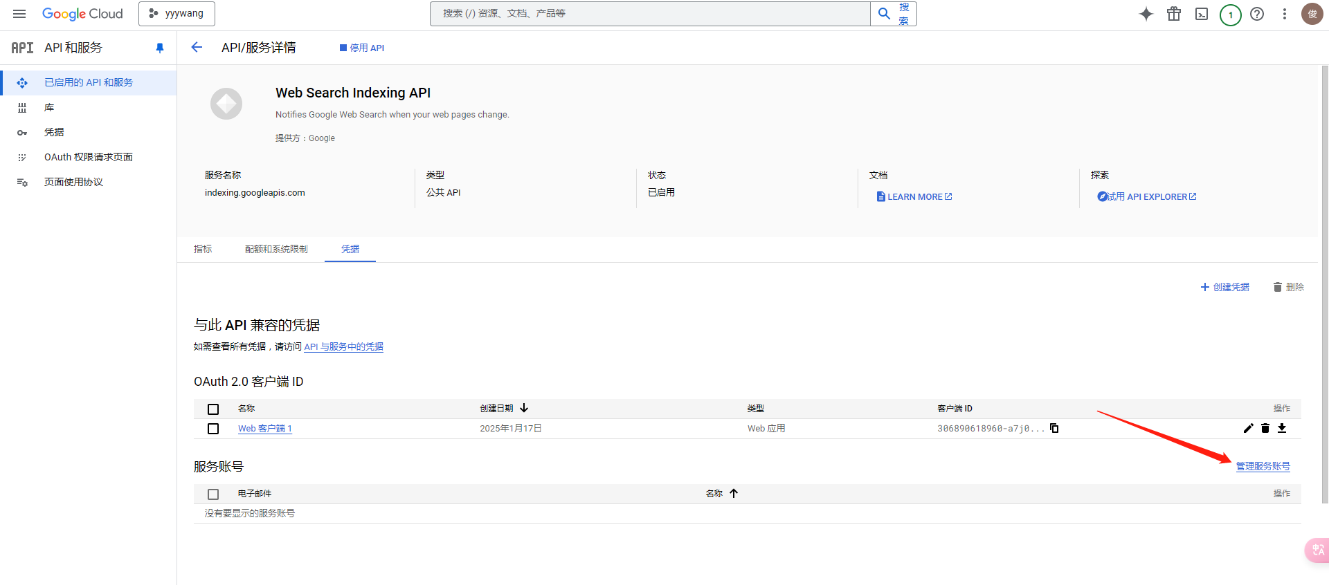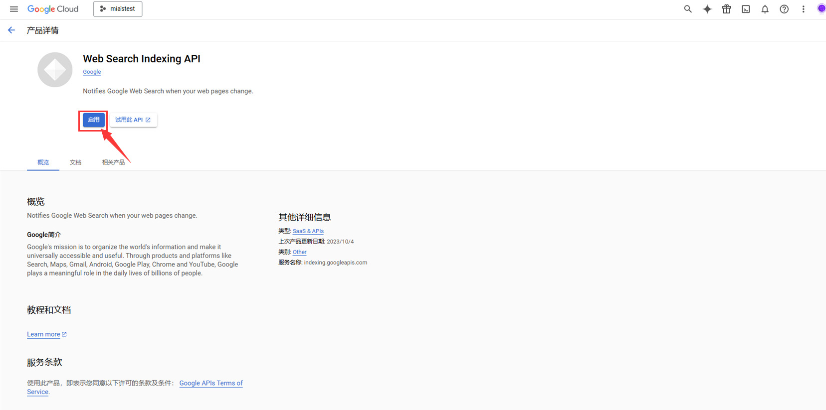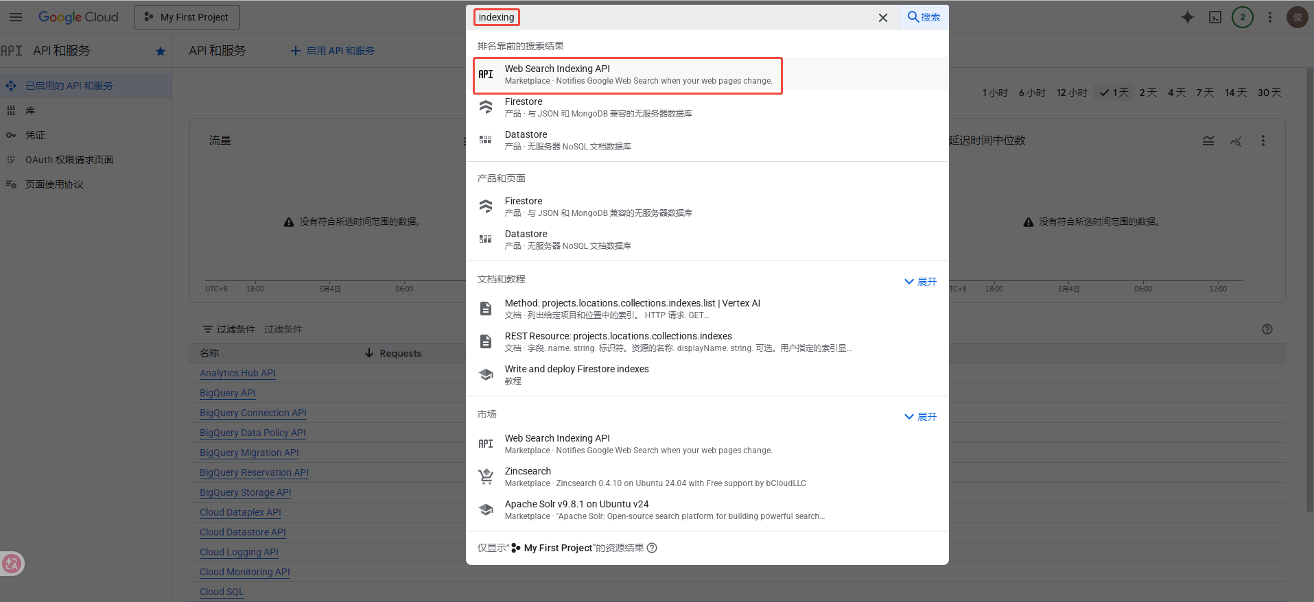 5、创建项目后,在页面顶部的输入框中搜索“indexing”并点击“Web Search Indexing API”