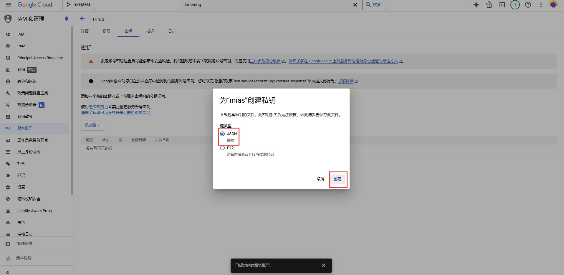 13、key的类型选择json,点击create按钮后,密钥文件将自动下载到您的电脑中,这意味着您已经成功创建密钥。