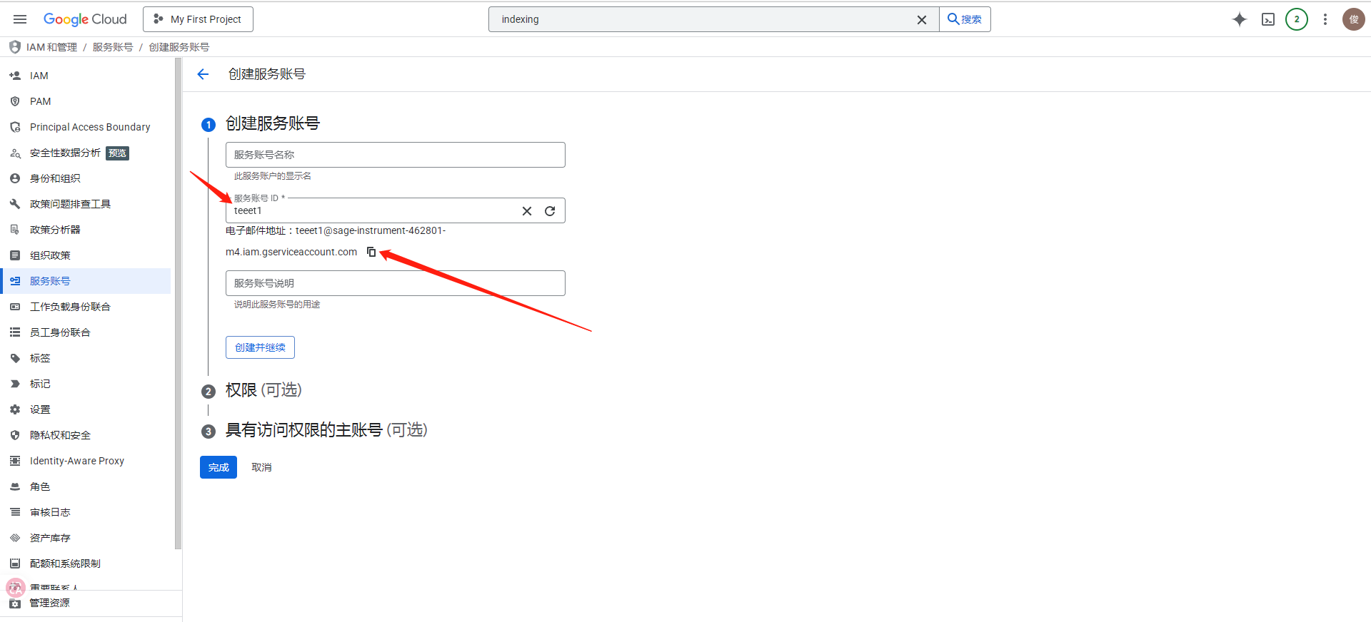 10、在创建服务账号页面中,输入自定义服务账号ID,复制保存电子邮件地址(重要),稍后在谷歌站长平台会用到它
