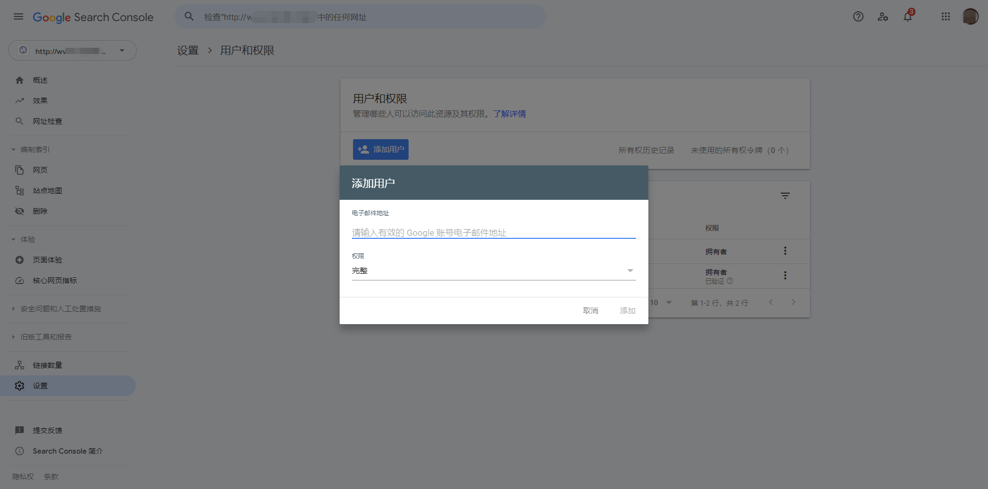 17、在弹窗中粘贴在谷歌云平台复制保存的电子邮件地址(步骤10获得),同时确认该用户的权限为“完整”