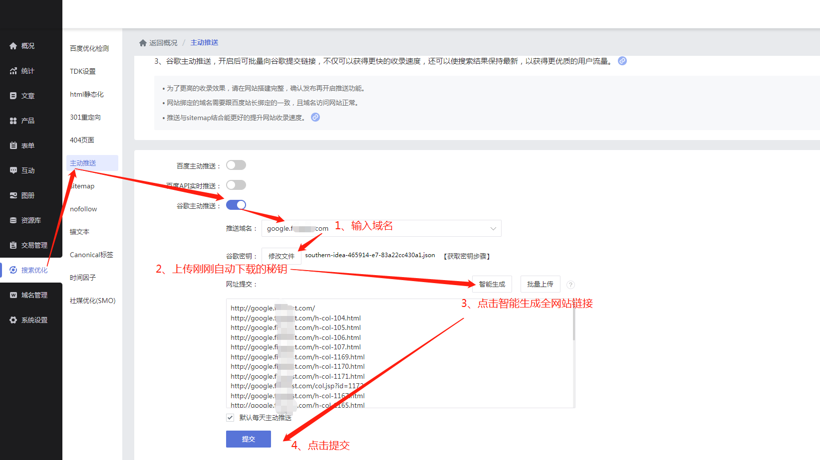 19、返回凡科后台,启用“谷歌主动推送”功能,输入域名,上传秘钥文件,点击智能生成,最后点提交