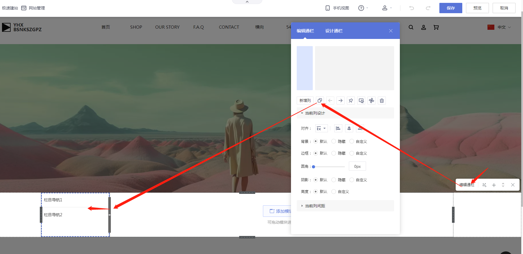 点击一级栏目下的空白通栏,新增一列并按住列间隔条左移合适大小