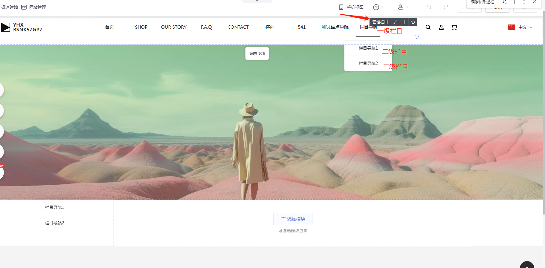 点击管理栏目,新增栏目导航设计所需的一级栏目与二级栏目