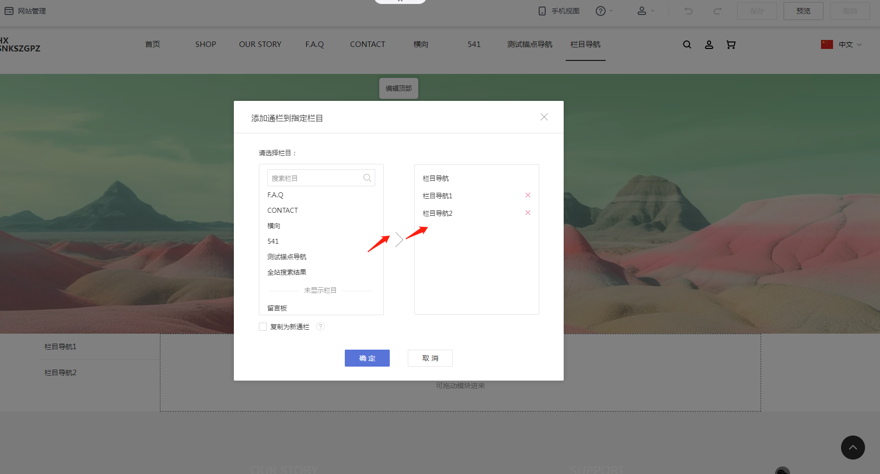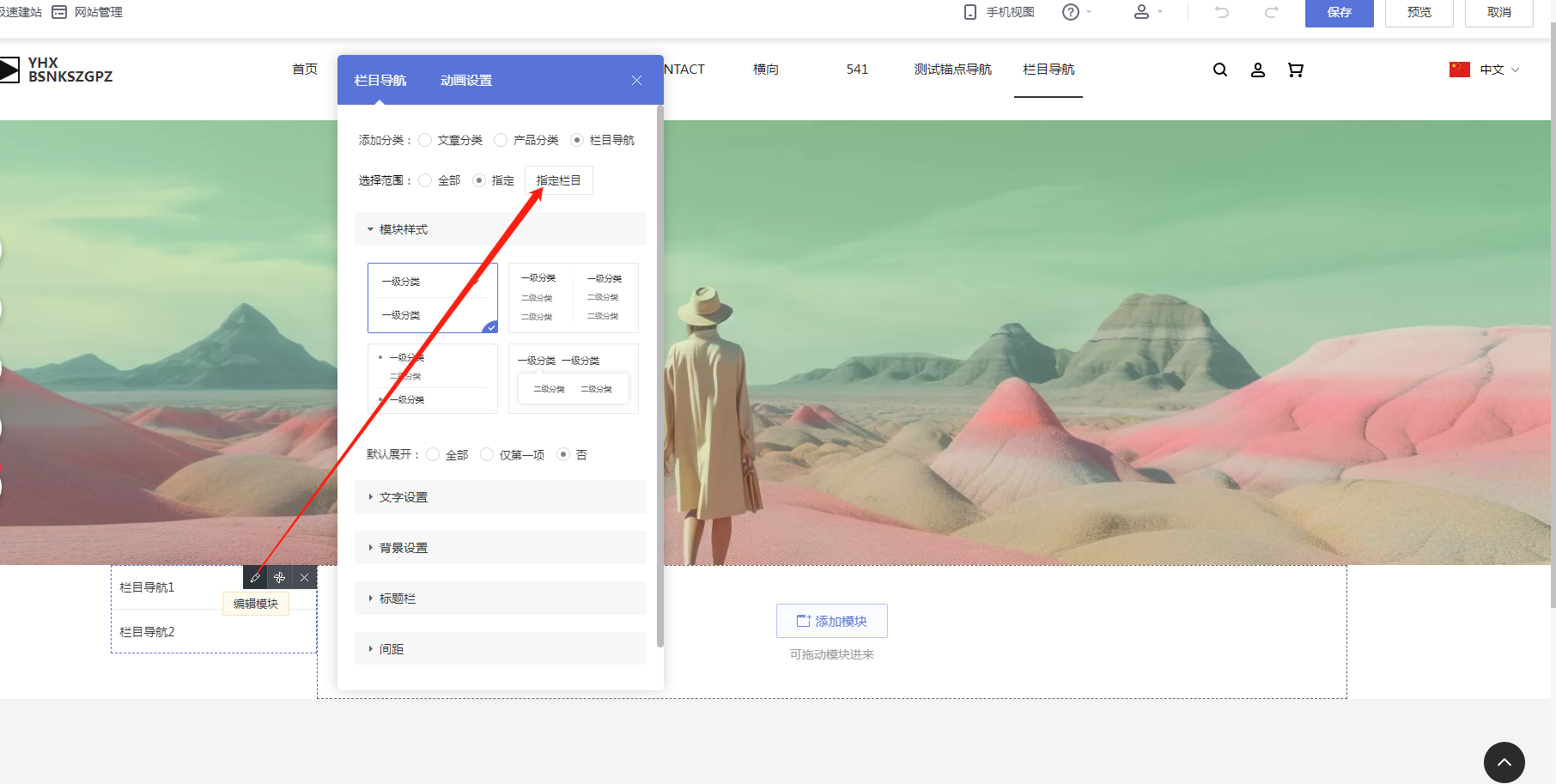 新增栏目导航模块到第一列并设置需展示的二级栏目作为导航
