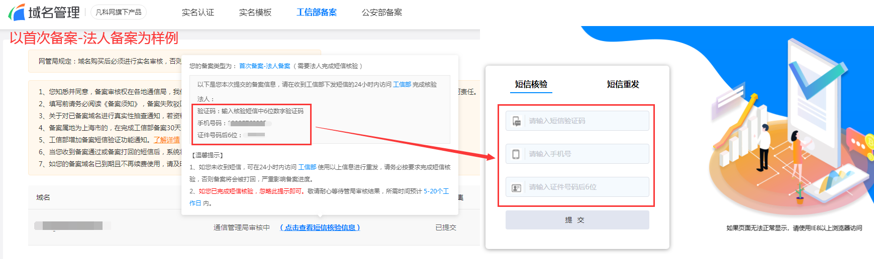 根据工信部要求,自2020年8月17日起,中国内地(大陆)提供服务的网站进行备案时需进行短信核验,您在凡科提交备案申请通过接入商审核后,会收到工信部发送的核验短信,您需要在收到短信的24小时内完成短信核验,备案申请才能进入管局审核。