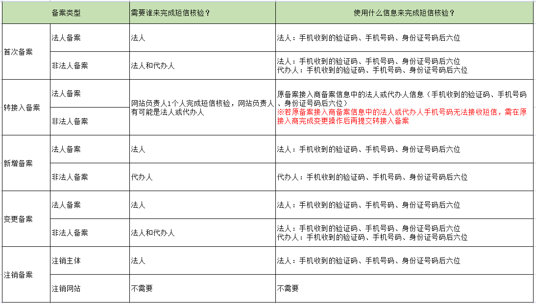 1. 需要短信核验的备案类型