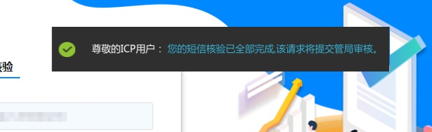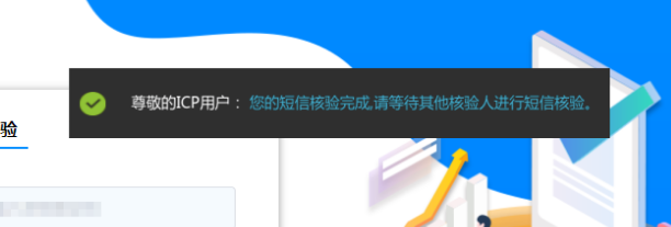 2.2 提交后,请留意页面提示短信核验结果,如系统提示【您的短信核验完成,请等待其他核验人进行短信核验】,说明您的备案中还有其他需验证的手机号码,请联系其他负责人及时完成核验,如超过24小时未核验,工信部系统将会备案进行退回。