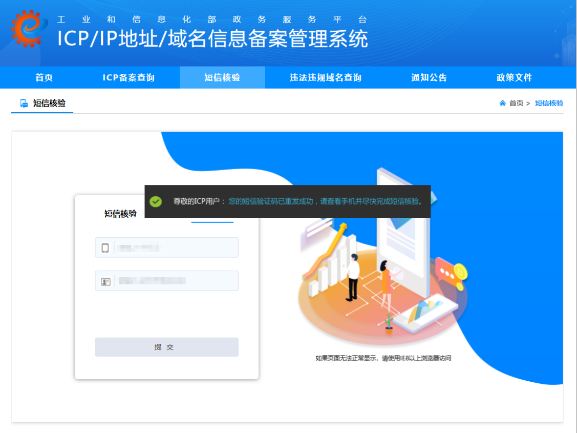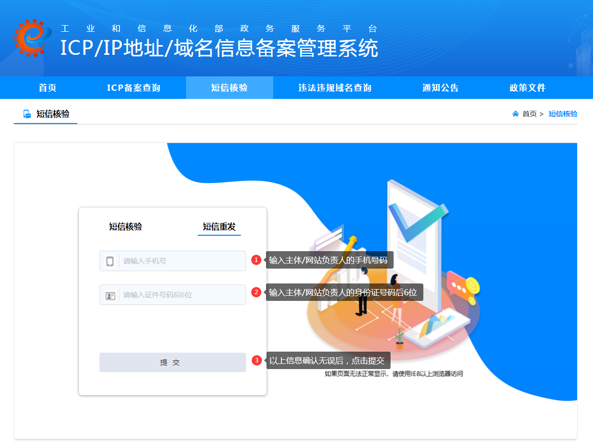 3.1 访问工信部备案管理系统短信核验页面(https://beian.miit.gov.cn/#/Integrated/ComplaintA),点击短信重发,依次填写验证信息(手机号码、身份证号码后六位),点击【提交】按钮。(如网站负责人收不到核验短信,请在页面输入网站负责人的手机号码和身份证号码后6位,再次获取短信验证码)。